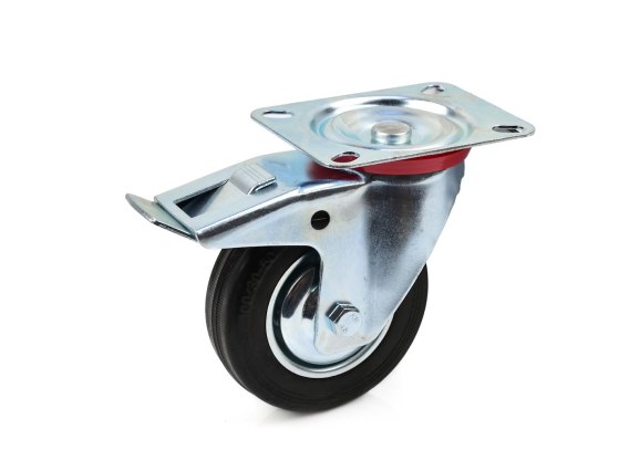Koło obrotowe o średnicy 100mm z blokadą. Rdzeń koła (felga) jak i obudowa wykonane zostały ze stali, opona natomiast z wysokiej jakości gumy która poprawia przyczepność koła, a także zapobiega rysowaniu podłoża.