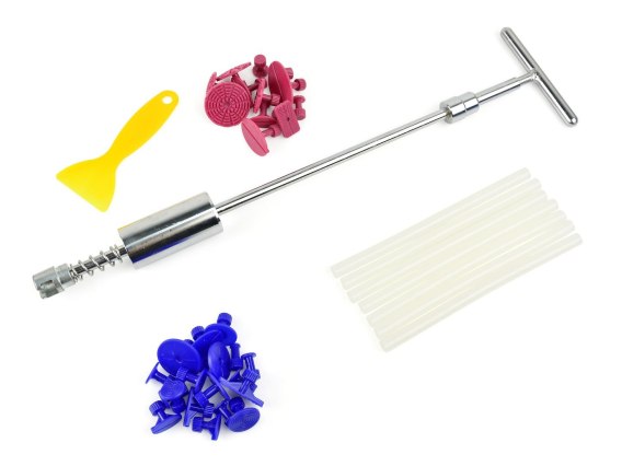 Zestaw naprawczy przeznaczony do usuwania wgnieceń w karoserii samochodu. Zestaw jest łatwy w użyciu, a co najważniejsze w 100% bezpieczny dla lakieru samochodowego. W skład zestawu wchodzi młotek bezwładnościowy do wyciągania wgnieceń, komplet 28 grzybków o różnych kształtach i rozmiarach, 7 lasek kleju termotopliwego oraz szpachelka do usuwania kleju.