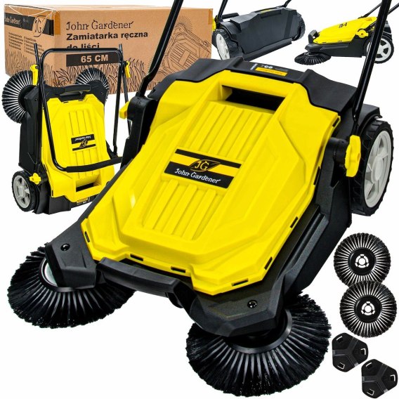 Całość porusza się na ogumionych kołach, co zapewnia dobrą przyczepność do podłoża i komfort prowadzenia. Zamiatarka jest lekka, składana i wyposażona w piankową, miękką rączkę – więc nie tylko skutecznie działa, ale też wygodnie się ją przechowuje.