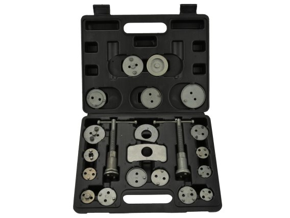 Profesjonalny 21-elementowy zestaw do cofania / wyciskania tłoczków hamulcowych, niezbędny przy naprawach pojazdów wyposażonych w hamulce tarczowe.